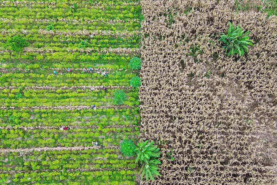 Foto udara sejumlah petani memanen jagung di kawasan KPH Banyuwangi Utara Papring, Banyuwangi, Jawa Timur, Senin (15/9/2025). Data Kementerian Kehutanan mencatat Perhutanan Sosial dimanfaatkan 1,4 juta keluarga dengan nilai ekonomi mencapai ratusan miliar rupiah hingga September 2025, di antaranya dari komoditas jagung senilai Rp18,36 miliar, getah Rp23,46 miliar dan biji kopi Rp17,49 miliar. ANTARA/Budi Candra Setya/gus
