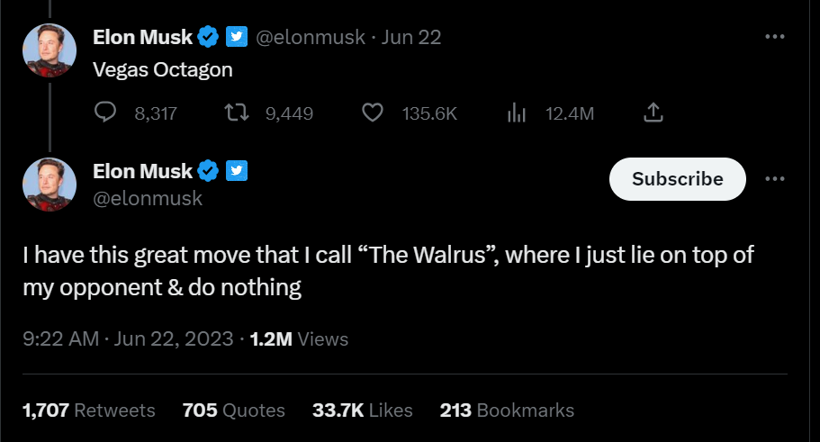 “Saya siap bertanding di ring Apabila dia siap lol,” tulis Elon, dikutip Jumat (23/6/2023).