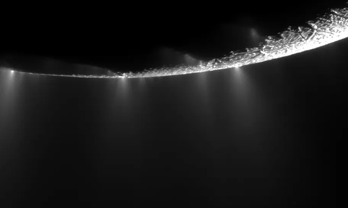 Bulan es Saturnus, Enceladus, selama ini dianggap Mempunyai lautan Dasar tanah yang mendukung kehidupan, sebagaimana diduga dari semburan uap air yang diamati wahana Cassini.(NASA)