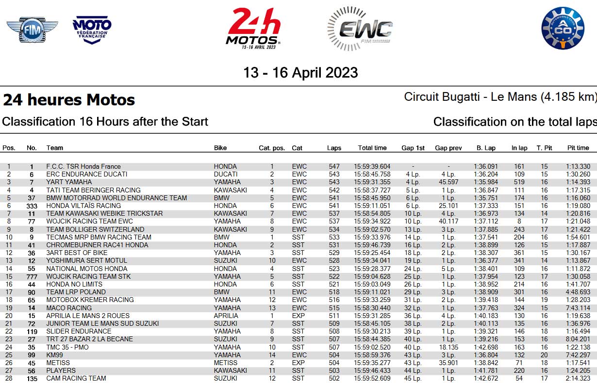 Di belakang F.C.C. Skuad TSR Honda Prancis yang terdiri dari Mike Di Meglio, Josh Hook dan Alan Techer hadir ERC Endurance Ducati (David Checa, Chaz Davies dan Philipp Öttl) di posisi kedua yang kuat dalam waktu 16 jam disusul YART Yamaha ketiga dalam urutan keseluruhan.