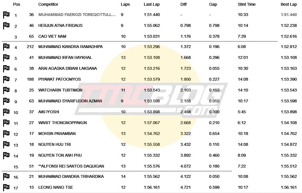 pada lima menit terakhir, Herjun Naik ke posisi dua . Menit ke 11 Faerozi memimpin dengan 1:52,332. Menit ke 13 Herjun memimpin dengan 1:52,238. Lap terakhir Time attack sangat dekat antara pembalap