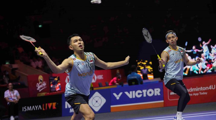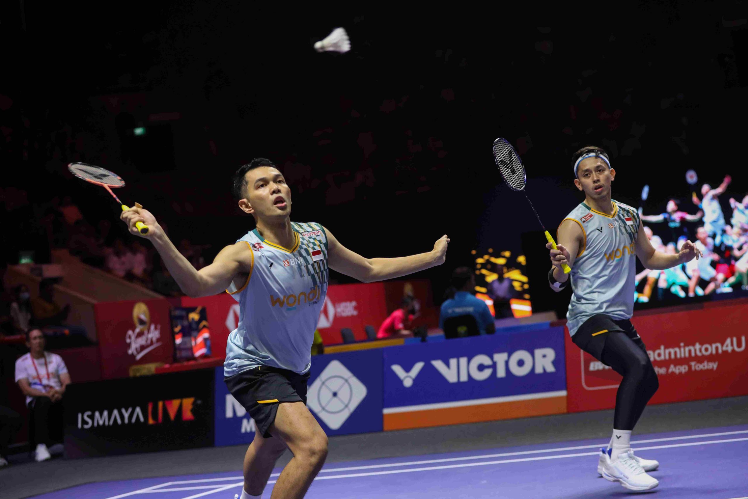 Pebulu tangkis ganda putra Indonesia Fajar Alfian/Muhammad Rian Ardianto berusaha mengembalikan kok ke arah pebulu tangkis ganda putra Denmark, Daniel Lundgaard/Mads Vestergaard, pada babak 32 besar Indonesia Open 2025 di Istora Senayan, Gelora Bung Karno (GBK), Jakarta, Rabu (4/6/2025). Ganda putra Indonesia Fajar/Rian melangkah ke babak selajutnya setelah menang dengan skor 21-10, 21-19. MI/RAMDANI/Ppj