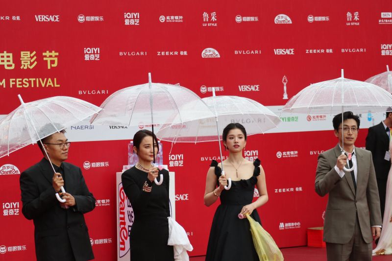 Aktor, Pengarah adegan, dan insan perfilman lainnya menghadiri upacara pembukaan dan acara karpet merah yang dilaksanakan di area terbuka di Yanqi Lake International Convention and Exhibition Center di Distrik Huairou, Beijing, China, meski hujan turun.