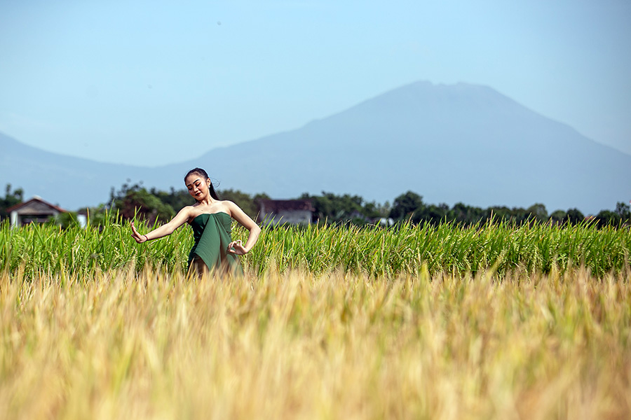 Seniman menari di pematang sawah pada Festival Mbok Sri di Desa Delanggu, Klaten, Jawa Tengah, Minggu (7/9/2025). Festival yang digelar sebagai ungkapan syukur petani atas hasil pertanian tersebut sekaligus menjadi media komunikasi menyuarakan pentingnya menjaga kekayaan alam pertanian di tengah arus industrialisasi melalui pendekatan seni dan budaya. ANTARA/Mohammad Ayudha/gus