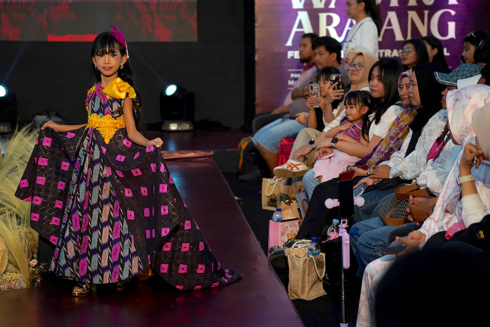 Peserta mengikuti lomba peragaan busana pada Festival Seni Tradisional diĀ  Makassar, Sulawesi Selatan, Jumat (12/9/2025). Festival yang diprakarsai Balai Pelestarian Kebudayaan (BPK) Distrik XIX bekerja sama dengan Dewan Kerajinan Nasional Daerah (Dekranasda) tersebut menghadirkan pameran kain tenun dari berbagai daerah, fashion show, hingga pentas seni tradisional bertema wastra sebagai upaya membangun ekosistem pemajuan kebudayaan, khususnya melalui warisan budaya tenun.