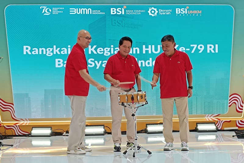 Direktur Istimewa Bank Syariah Indonesia (BSI) Hery Gunardi (tengah) didampingi Wakil Direktur Istimewa Bob Tyasika Ananta (kanan) dan Direktur Retail Banking Harry Gusti Istimewa memukul drum saat meresmikan ajang UMKM Festival di Kantor Pusat BSI, Gatot Subroto, Jakarta, Rabu (14/8/2024). PT Bank Syariah Indonesia Tbk (BSI) mengajak pelaku usaha mikro kecil dan menengah (UMKM) memeriahkan peringatan hari kemerdekaan Indonesia ke-79 dalam ajang BSI UMKM Festival. Acara yang digelar pada 14-15 Agustus di Kantor Pusat BSI di Jakarta, juga sekaligus memperingati hari UMKM nasional 12 Agustus. MI/Susanto/Per