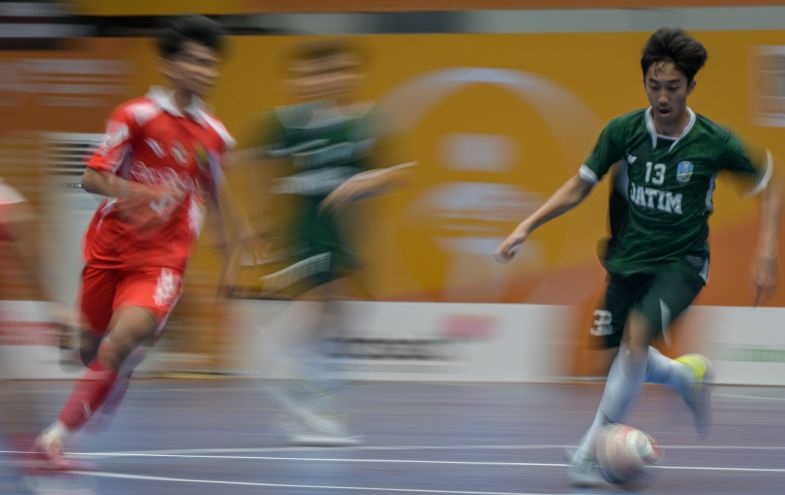 Pemain futsal Jatim Diaz Firman (kanan) menggiring bola dengan dibayangi pemain futsal Kaltim Fajar Aidil (kiri) pada pertandingan final futsal putra PON XXI Aceh-Sumut 2024 di Arena Futsal Dinas Pemuda dan Olahraga Sumatera Utara (Disporasu), Deli Serdang, Sumatera Utara, Minggu (8/9/2024). ANTARA FOTO/Fauzan/rwa.