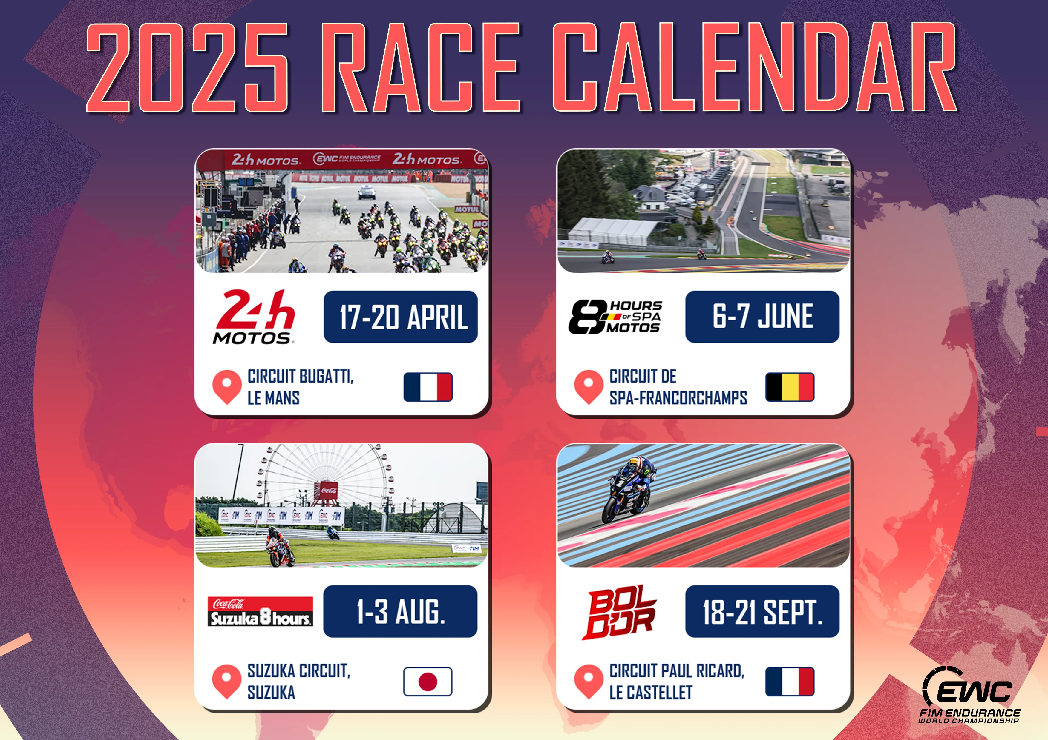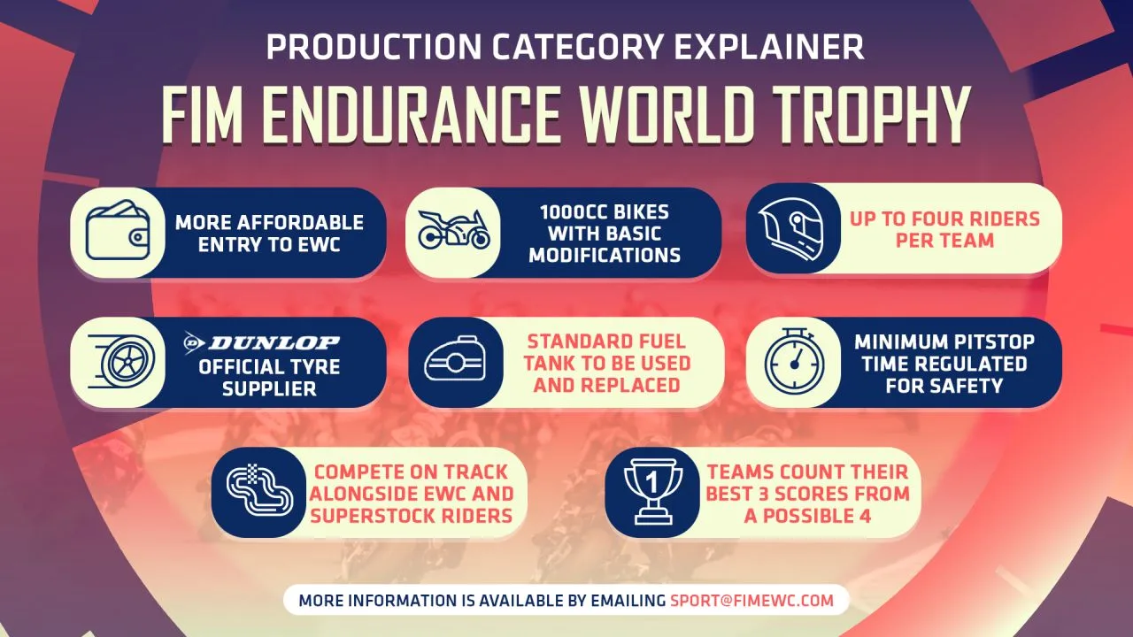 Dilengkapi oleh pemasok ban Formal Dunlop, FIM Endurance World Trophy telah dikembangkan oleh Penganjur EWC Warner Bros. Discovery (WBD) Sports dalam kemitraan erat dengan Fédération Internationale de Motocyclisme (FIM).