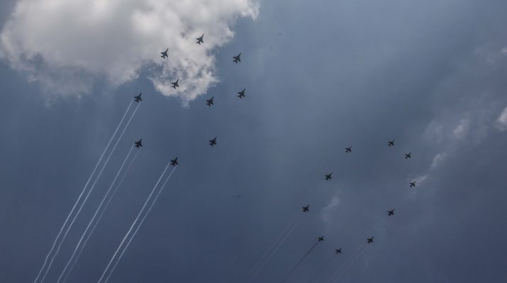 Pesawat tempur F-16 TNI AU membentuk Susunan 80 melintasi langit kawasan Monas dan Istana Merdeka Ketika Upacara Peringatan Detik-Detik Proklamasi Kemerdekaan ke-80 Republik Indonesia di Jakarta, Minggu (17/8/2025). Atraksi tersebut merupakan rangkaian dari peringatan HUT ke-80 RI bertemakan Bersatu, Berdaulat, Rakyat Sejahtera, Indonesia Maju. MI/RAMDANI/rdi