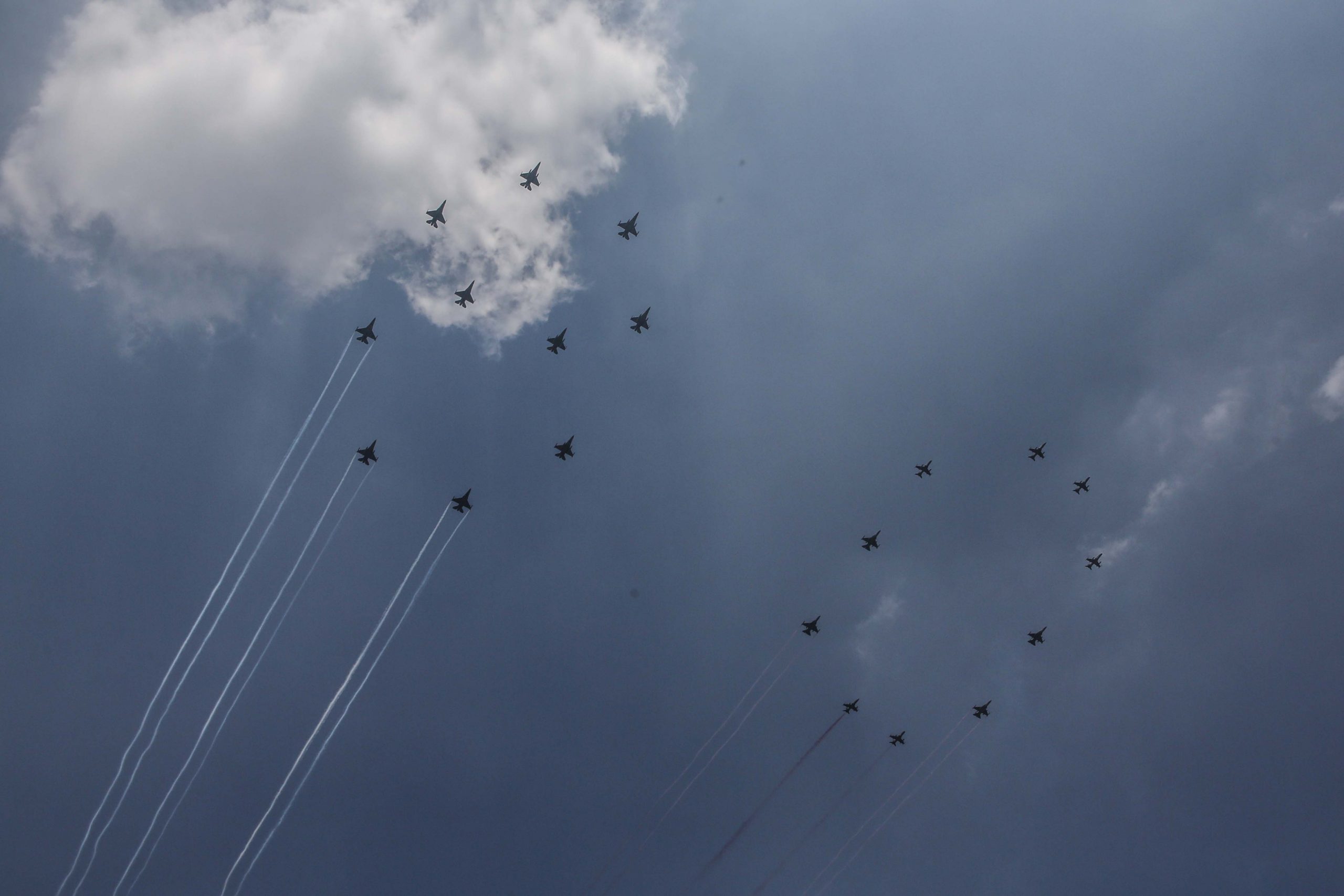 Pesawat tempur F-16 TNI AU membentuk Susunan 80 melintasi langit kawasan Monas dan Istana Merdeka Ketika Upacara Peringatan Detik-Detik Proklamasi Kemerdekaan ke-80 Republik Indonesia di Jakarta, Minggu (17/8/2025). Atraksi tersebut merupakan rangkaian dari peringatan HUT ke-80 RI bertemakan Bersatu, Berdaulat, Rakyat Sejahtera, Indonesia Maju. MI/RAMDANI/rdi