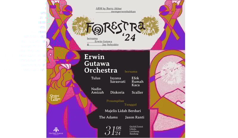 FORESTRA 2024, pertunjukan musik orkestra yang unik di Indonesia, akan kembali digelar di tengah keindahan hutan. Acara ini akan menghadirkan penampilan dari Erwin Gutawa Orchestra, berkolaborasi dengan Rela, Pengaruh Rumah Kaca, Nadin Amizah, Scaller, Isyana Sarasvati, dan Diskoria. Selain itu, penampilan pembuka dari Jason Ranti, The Terdapatms, dan Majelis Lidah Berduri juga akan memeriahkan acara.