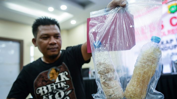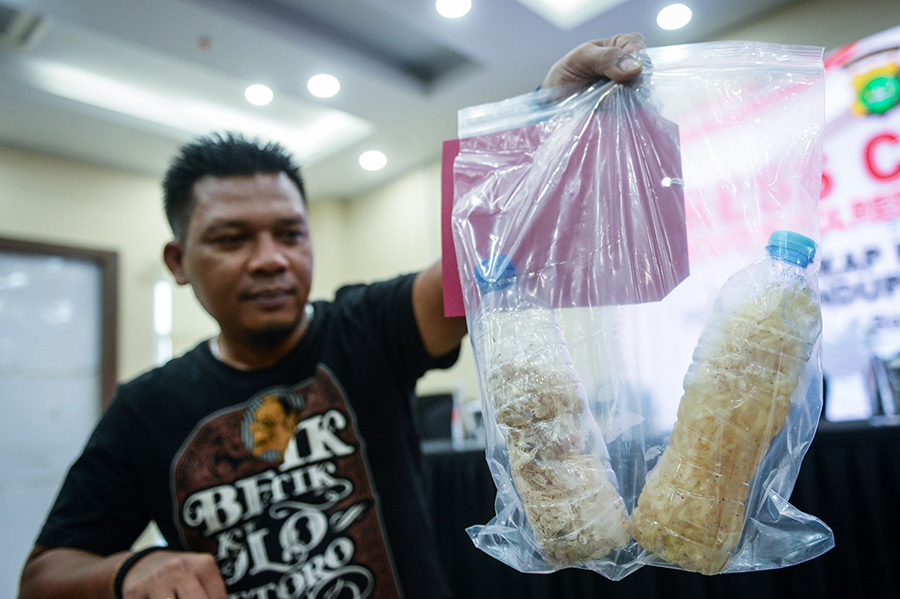 Petugas menunjukkan barang bukti benih bening lobster Demi ungkap kasus penyelundupan di Polresta Bandara Soekarno-Hatta, Kota Tangerang, Banten, Kamis (24/7/2025). Kepolisian menetapkan tujuh orang tersangka pada kasus penyelundupan 710.770 ekor benih bening lobster senilai Rp38.381.580.000 melalui Terminal Kargo Bandara Dunia Soekarno-Hatta yang ditujukan ke negara Vietnam. ANTARA/Putra M Akbar/gus