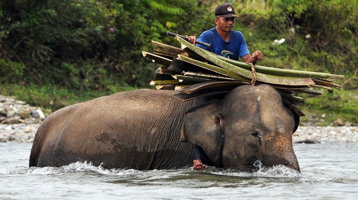 Mahout (pawang) menuntun gajah sumatra (Elphas maximus sumatranus) yang mengangkut pakan pelepah sawit menyebrangi sungai di Pusat Konservasi Gajah (PKG) Seblat di Kabupaten Bengkulu Utara, Bengkulu, Senin (12/5/2025). Sebanyak 10 gajah jinak terdiri dari tiga jantan serta tujuh betina dibina di kawasan pusat pelatihan gajah tersebut. ANTARA/Muhammad Izfaldi/gus