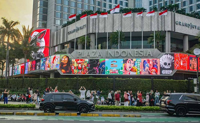 Anggota menyaksikan karya seni rupa yang dipamerkan melalui LED Videotron secara masif di kawasan Bundaran HI, Jakarta, Sabtu (17/08/2024). Pertunjukan pameran seni rupa secara digital selama 45 detik di seluruh videotron sepanjang Jalan Sudirman dan Jalan Thamrin dengan menampilkan 79 karya seniman visual itu untuk memeriahkan HUT ke-79 Kemerdekaan RI. Pertujukan galeri digital ini hasil kolaborasi JICAF (Jakarta Illustration & Creative Arts Fair) dan AMLI (Asosiasi Media Luar Griya Indonesia). MI/Usman Iskandar