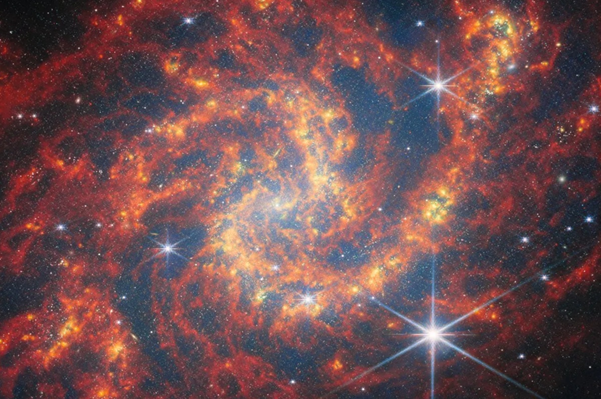 Terletak Sekeliling 45 juta tahun Terang dari Bumi di rasi bintang Canis Major, galaksi spiral berbatang ini dikenal sebagai NGC 2283. Galaksi ini Mempunyai batang pusat bercahaya yang dikelilingi oleh lengan spiral yang melingkar Lenggang, dipenuhi gugusan bintang dan gas antarbintang yang bersinar terang. JWST berhasil menangkap Grup-Grup bintang muda yang menerangi gas hidrogen di sekitarnya.