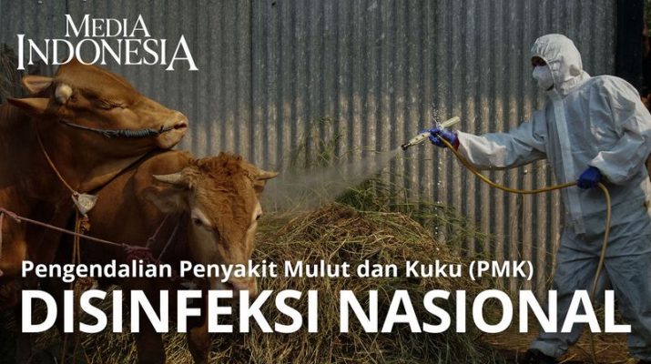 Petugas menyemprotkan cairan disinfektan dalam upaya pengendalian penyakit mulut dan kuku (PMK) di Kandang Sapi Habib Fathan, Jakarta Barat, Kamis (30/6/2022). Gerakan disinfeksi nasional yang diinisiasi Kementerian Pertanian serta didukung oleh Badan Penanggulangan Bencana Nasional (BNPB) dan Palang Merah Indonesia (PMI) ini untuk pengendalian PMK yang menyerang ternak di 19 provinsi.