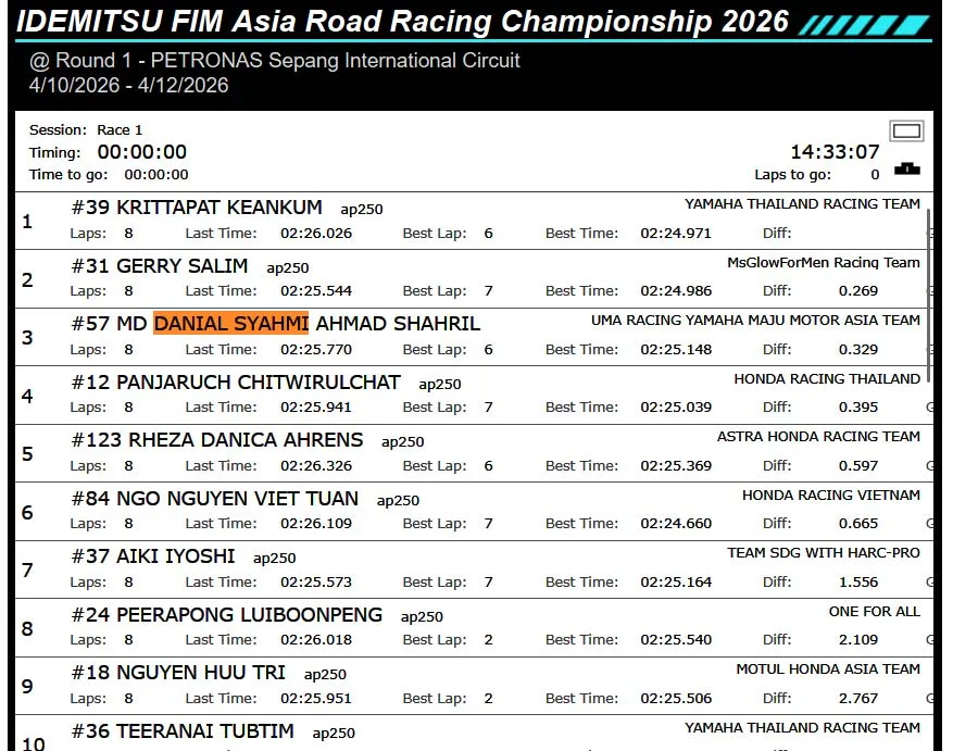 Memanfaatkan kekacauan di lap terakhir tersebut, pebalap Thailand Krittapat Keankum akhirnya melintasi garis finish pertama dan memenangkan Race 1 AP250 ARRC Sepang 2026. Gerry Salim berhasil tampil tenang dan mengamankan podium kedua (P2), disusul oleh pebalap tuan rumah Danial Syahmi di posisi ketiga. Sementara itu, Rheza Danica Ahrens harus puas finish di posisi ke-5.