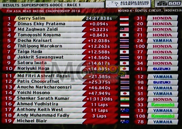 Lap 16 Empat motor CBR600RR di depan membentuk Pack 1 dengan Gery salim memimpin di awal . . zaqwan masuk dari dalam di R1 dan dibalas oleh Gerry salim . .. dan akhirnnya Gerry salim memenangkan Race 1 SS600 ARRC Seri 4 sentul 2016 dengan jarak hanya 0,094 detik dari posisi kedua Dimas Ekky . . duo Indonesia di Podium race 1 ini