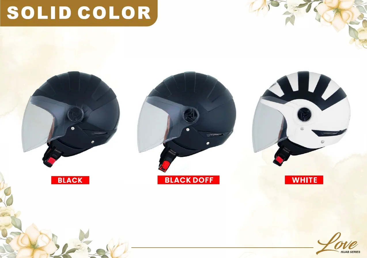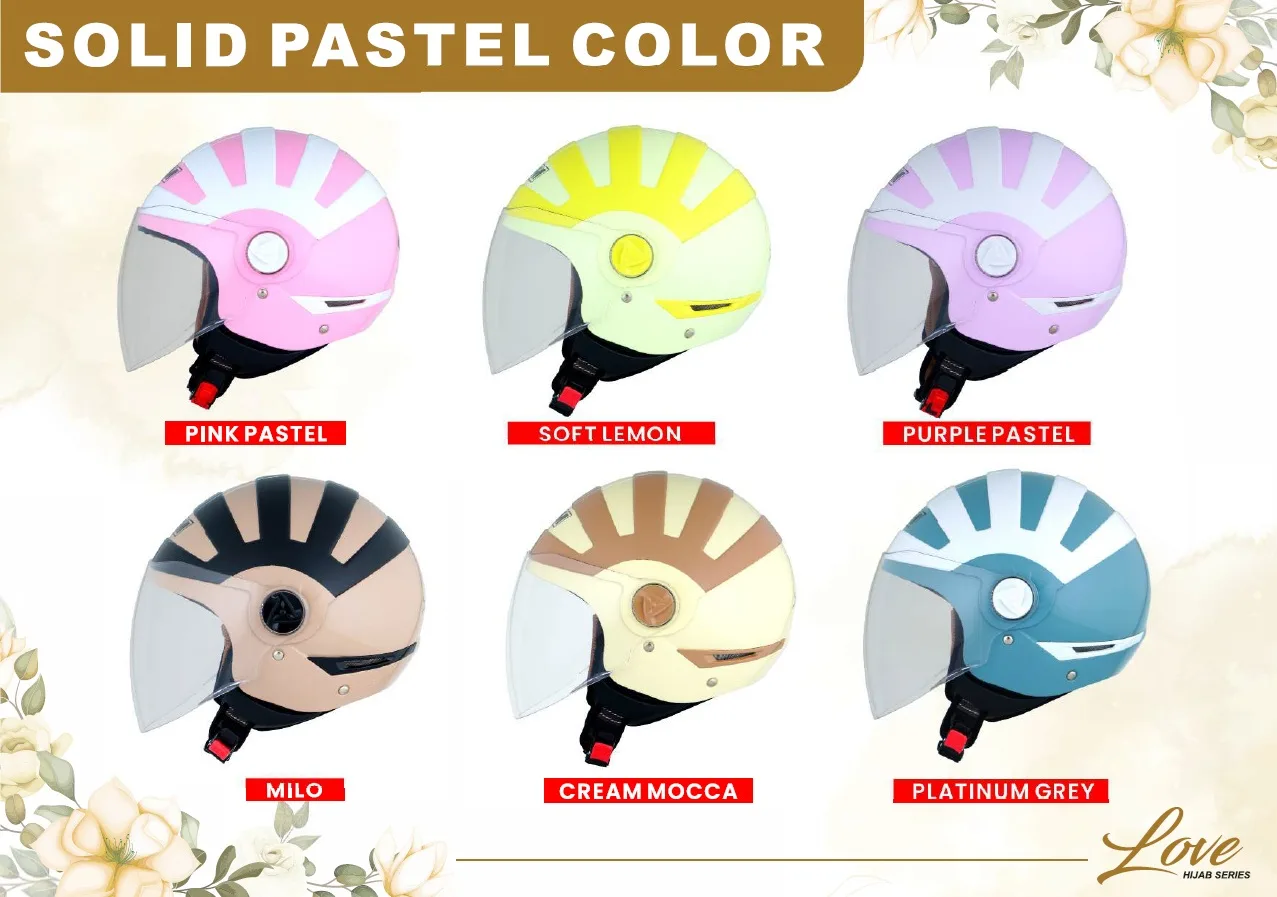 Helm open face Spesifik Perempuan yang dilengkapi sistem pengikat model micrometric buckle strap ini dijual dalam 3 pilihan Rona Solid; Black, Black Doff dan White, dan 6 pilihan Rona pastel; Pink, Soft Lemon, Purple, Milo, Mocca dan Platinum Grey, dan dijual mulai dari harga Rp 350.000.