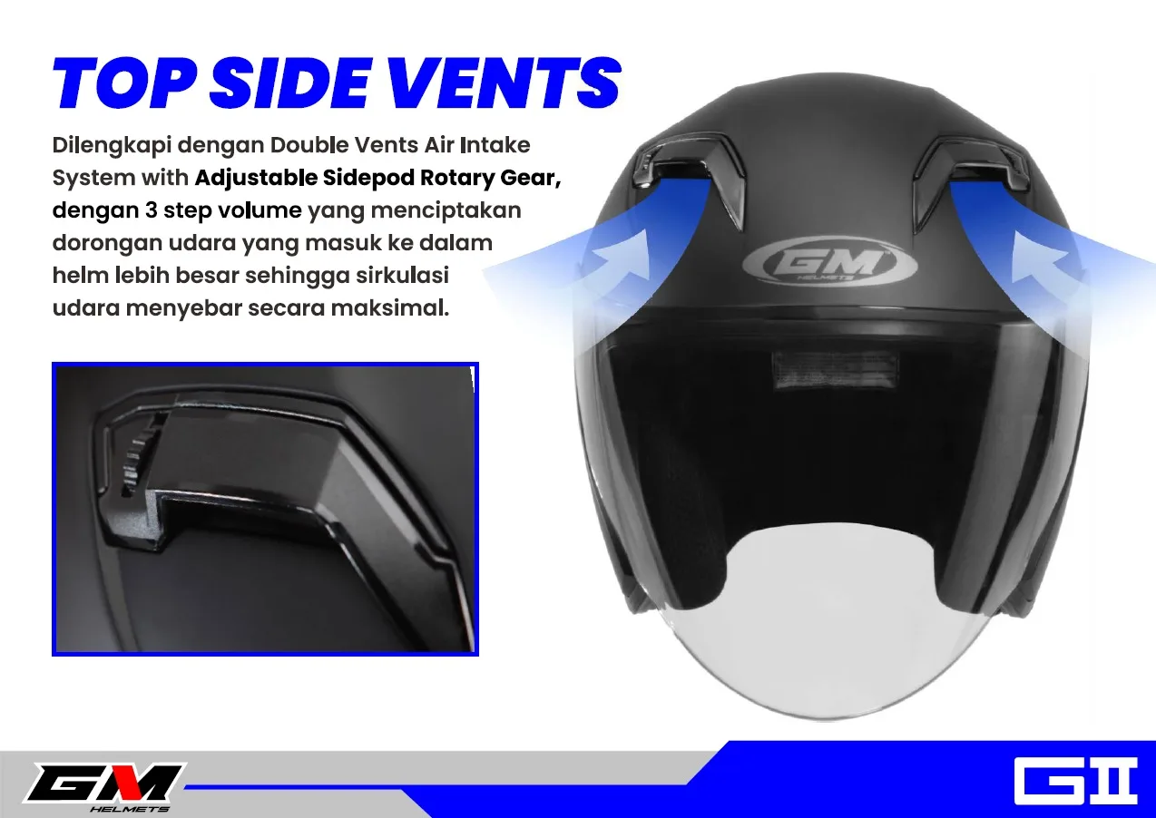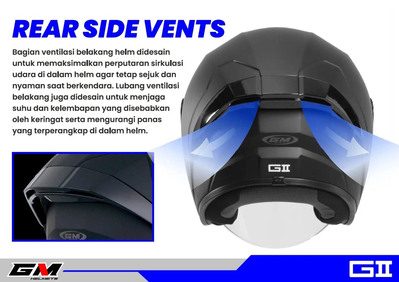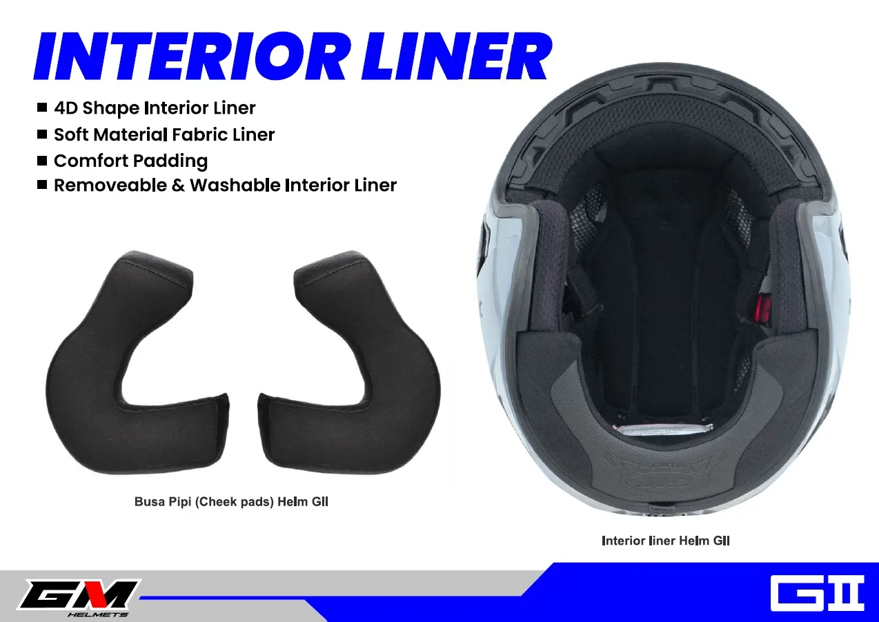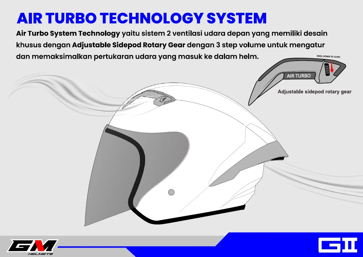 G2 sejatinya merupakan varian update dari model sebelumnya – G1 – yang sudah dirilis tahun Lewat. Dibuat dari material ADVANCED THERMO POLYMER SHELL yang dilengkapi dengan Ultra Soft Micro Fiber Interior Liner. Helm terbaru G2 Mempunyai 2 Jendela udara di bagian depan dengan teknologi yang GM sebut dengan Air Turbo System with Adjustable Sidepod, sistem 2 Jendela udara yang didesain Spesifik berbentuk rotary gear dengan 3 step volume bukaan Jendela guna mengatur dan memaksimalkan pertukaran udara yang masuk ke dalam helm menjadi lebih besar dan menyebar ke seluruh interior helm.