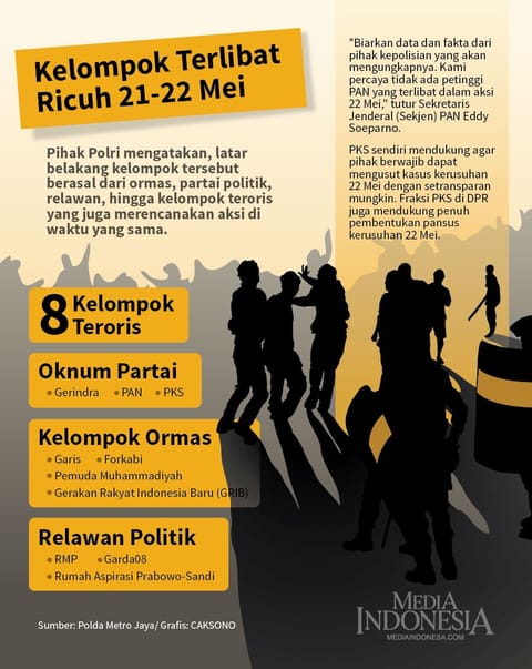 Infografis 26/11/2024 Golongan Terlibat Ricuh 21-22 Mei Diposkan Oleh:administrator infografis(caksono) Pihak Polri mengatakan, latar belakang Golongan tersebut berasal dari ormas, partai politik, relawan, hingga Golongan teroris yang juga merencanakan aksi di waktu yang sama. Cek Artikel: Negara-Negara yang Mempunyai Senjata Nuklir