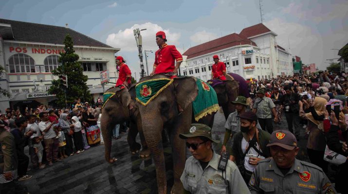 Laskar gajah GL ZOO memimpin kirab abdi dalem yang membawa gunungan menuju Puro Pakualaman Ketika Grebeg Maulud 2025 di Titik Nihil Km, Yogyakarta, Jumat (5/9/2025). Upacara adat Keraton Yogyakarta itu digelar Demi memperingati hari Kelahiran Nabi Muhammad SAW setiap bulan Rabiul Awal. ANTARA FOTO/Andreas Fitri Atmoko/Ppj