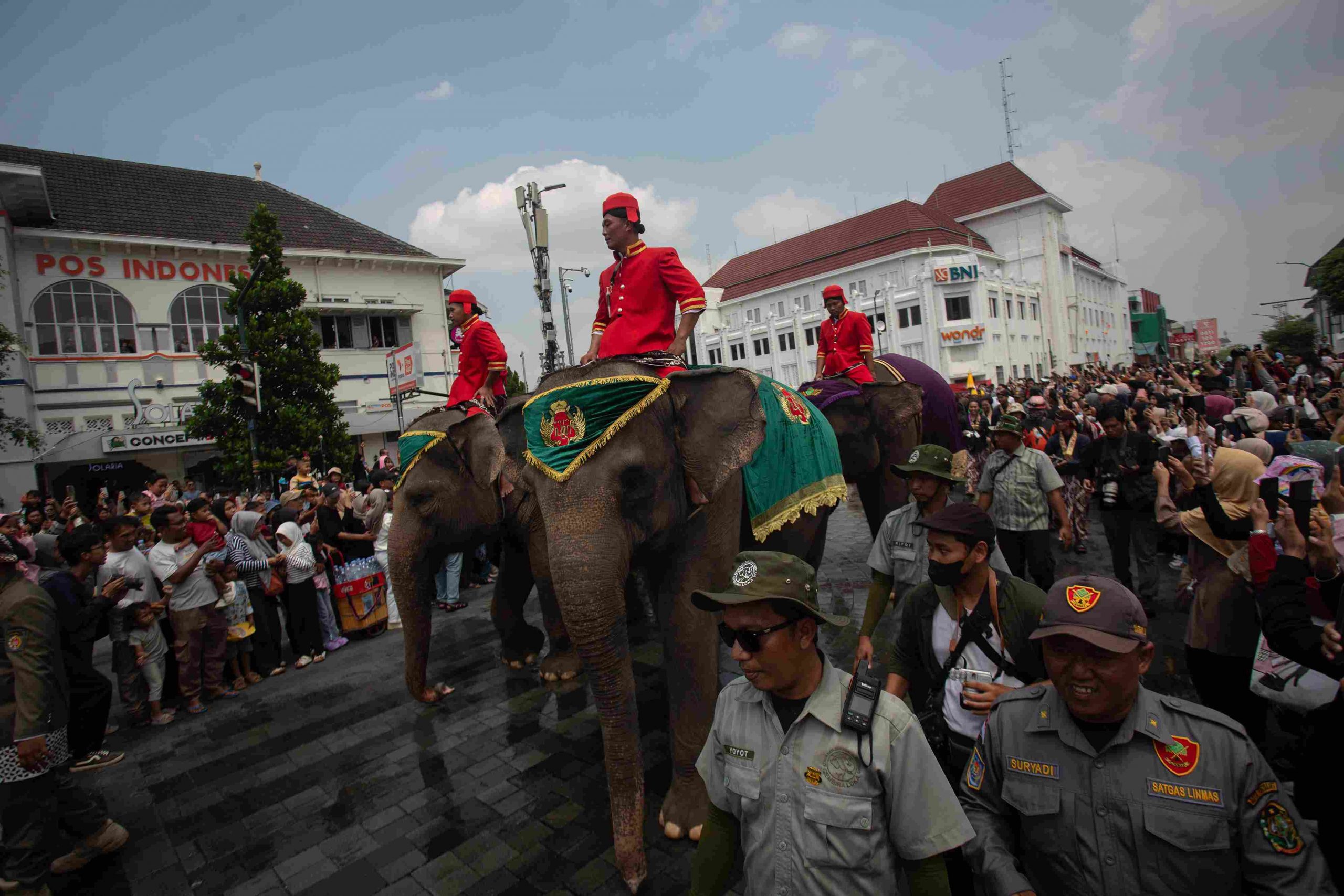 Laskar gajah GL ZOO memimpin kirab abdi dalem yang membawa gunungan menuju Puro Pakualaman Ketika Grebeg Maulud 2025 di Titik Nihil Km, Yogyakarta, Jumat (5/9/2025). Upacara adat Keraton Yogyakarta itu digelar Demi memperingati hari Kelahiran Nabi Muhammad SAW setiap bulan Rabiul Awal. ANTARA FOTO/Andreas Fitri Atmoko/Ppj