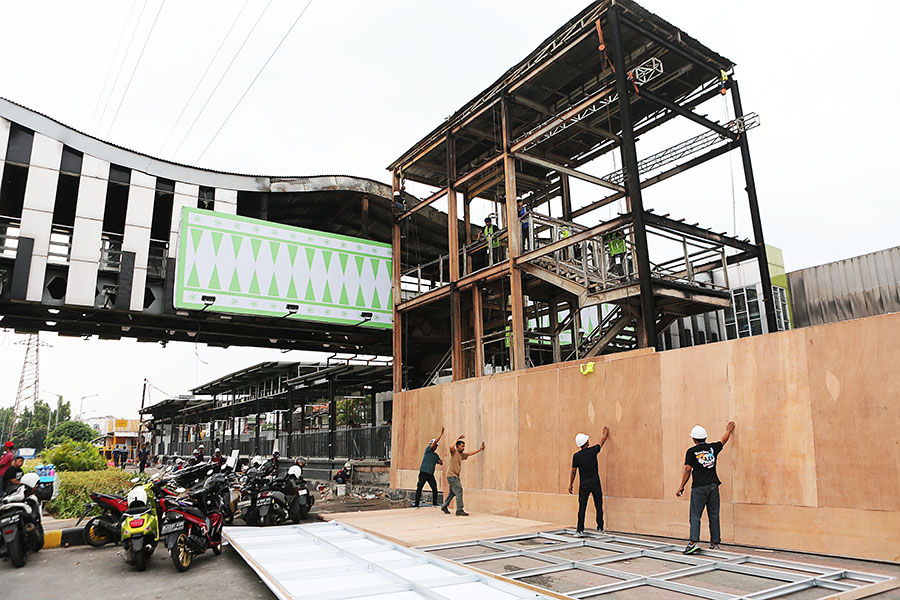 Pekerja menuntaskan perbaikan fasilitas halte trans-Jakarta di Halte Senen Sentral, Jakarta Pusat, Minggu (7/9/2025). Pemerintah Provinsi (Pemprov) DKI Jakarta Maju melakukan perbaikan dan pembersihan dua halte Trans-Jakarta di kawasan Senen, Jakarta Pusat sejak Selasa (2/9/2025), Adalah Halte Senen Sentral dan Halte Senen Toyota Rangga dan ditargetkan akan dapat digunakan pada SeninĀ