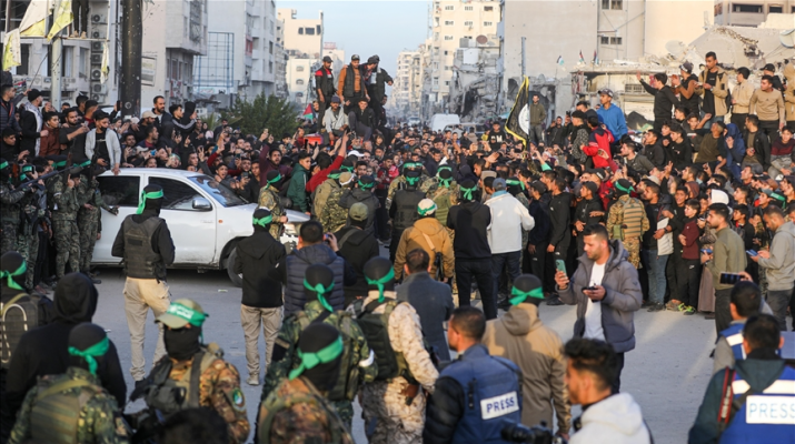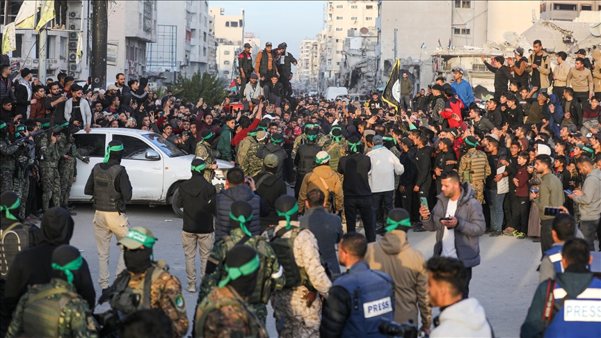 Momen detik-detik pembebasan empat sandera Israel oleh Hamas di Gaza, Sabtu, 25 Januari 2025. (Anadolu Agency)