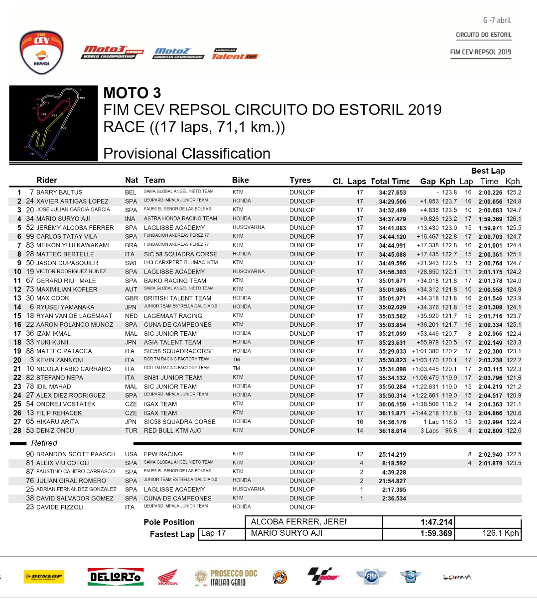 Super Mario merupakan debutan atau seorang Rookie di kategori Moto3 Junior World Championship memberikan penampilan terbaiknya di balapan yang kondisinya sulit. Hujan deras mengguyur Estoril sejak kemarin dan kondisi tersebut menyulitkan seluruh rider rider muda yang berlaga di Moto3 tak terkecuali Mario. Begitu race day, cuaca Lagi juga belum bersahabat sehingga memaksa rider bekerja ekstra dan berkonsentrasi penuh agar Dapat tampil kencang Tetapi juga menghindari kesalahan sendiri di lintasan yang basah dan licin.