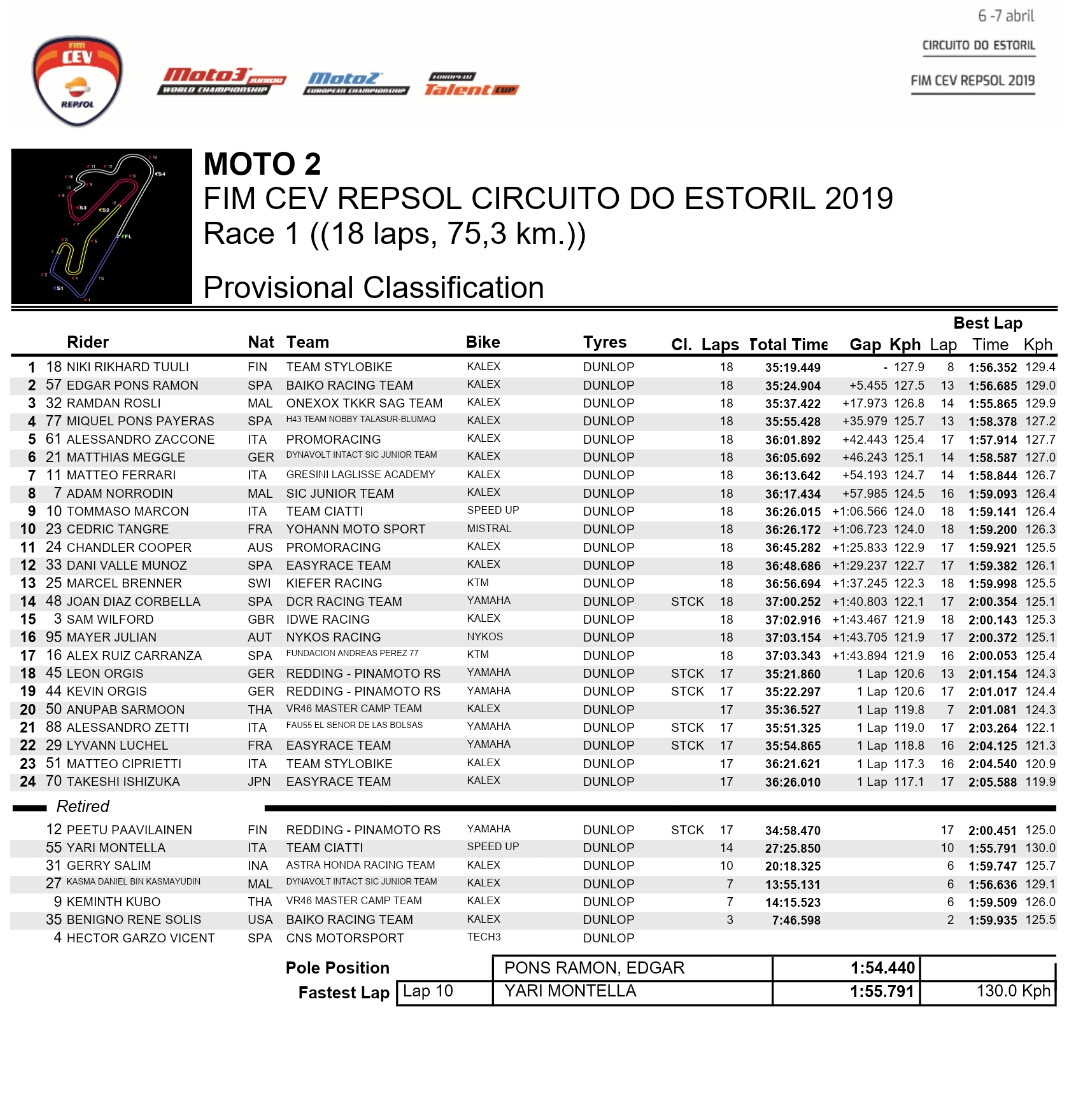 Di kategori lain, Gerry Salim sebetulnya memberikan penampilan yang cukup Berkualitas dengan masuk di posisi 6 pada Race 1 kategori Moto2 European dalam kondisi hujan. Naas bagi Gerry, alih alih Dapat mempertahankan posisinya Gerry harus menyerah pada Begitu balapan menyisakan 7 lap akibat kendala teknis. Motor bersasis Kalex dan bermesin CBR600RR tunggangannya tersebut kehilangan power secara tiba-tiba dan Tewas pada turn 4 sirkuit Estoril, sehingga Membikin dirinya Enggak Dapat melanjutkan balapan.