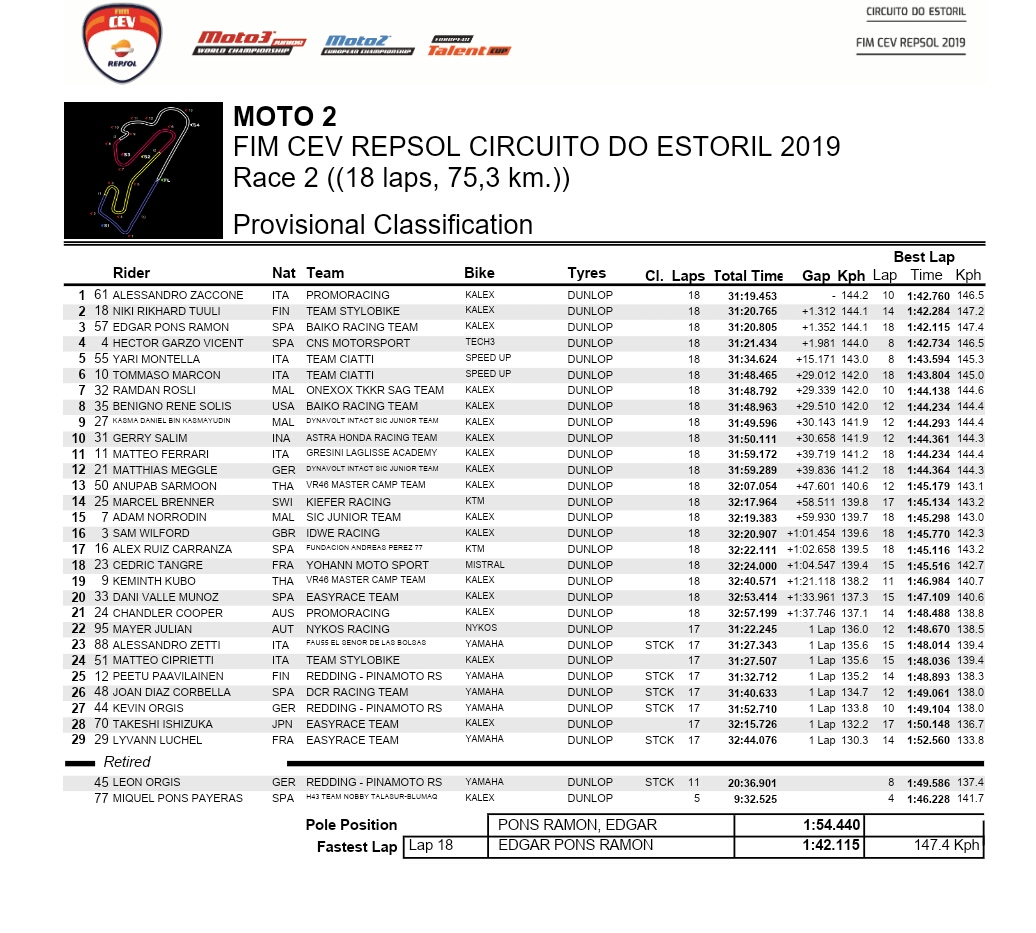 Posisi akhir Gerry di race kedua CEV Moto2 European adalah posisi 10 dengan selisih jarak waktu hingga 30 detik lebih dari pemenang race yakni Alessandro Zaccone asal Italia. Poin pertama Demi Gerry di musim perdananya Bertanding di ajang kejuaraan FIM CEV Moto2 European Championship, semoga Dapat lebih Bertanding Demi podium bahkan Bertanding memperebutkan kemenangan di balaon selanjutnya. Semangat Gerry dan Mario..!!