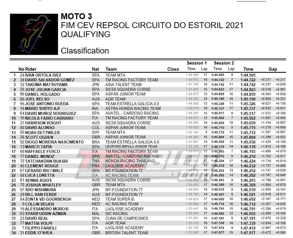 Dari kelas Moto3, Ivan Ortola dari team MTA yang menggunakan Motor KTM RC250R hadir tercepat secara akumulasi diikuti David Salvador dan Takuma Matsuyama. Sementara pembalap Indonesia Mario Suryo Aji akan start di Posisi grid 8 atau Row ke tiga pada satu race di hari ahad esok yang dimulai. Laptime terbaik mario pada Sesi Kualfikasikasi kedua juga cukup Berkualitas dimana berjarak 0,832 detik dari IVan.