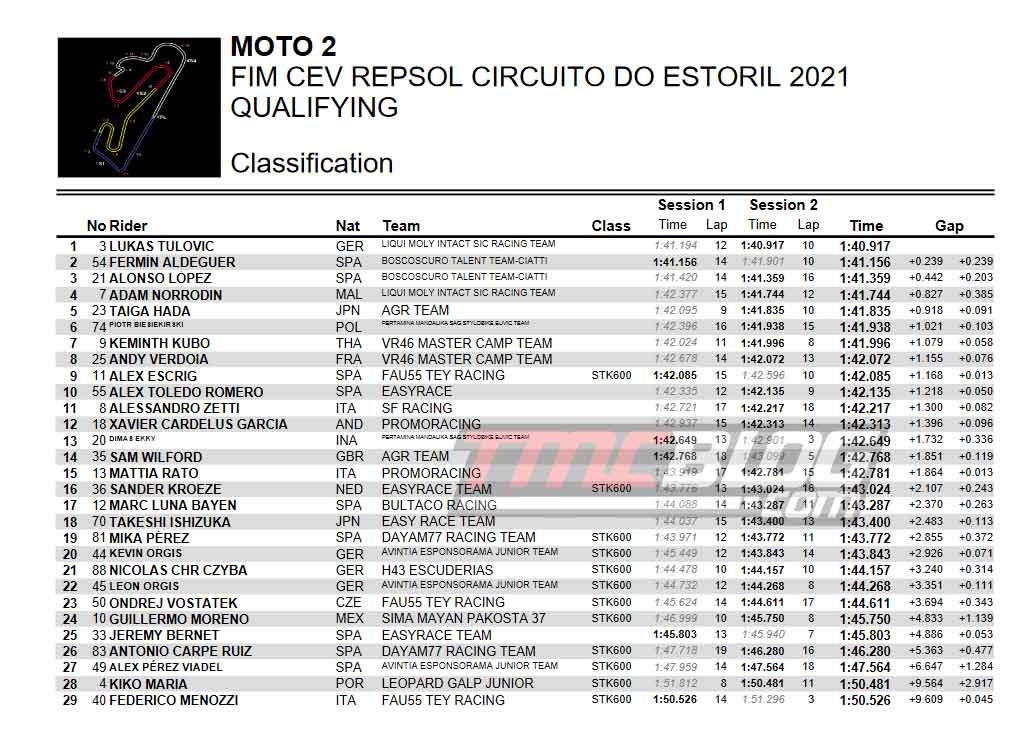 liputanindo.com – Setelah Hari Jumat Yang terganggu Oleh Hujan kemarin, pada hari sabtu Kepada masing masing kelas Moto2 European Championship dan Moto3 Jurnior World Championship dimana pada kedua kelas ini Terdapat wakil pembalap Indonesia telah menjalani dua kali Sesi Kualifikasi. Dari dua kali kualifikasi ini diperolehlah Nomor akumulasi terbaik yang menentukan Posisi Grid start kedua Kelas ini pada race Hari ahad 25/04/2021