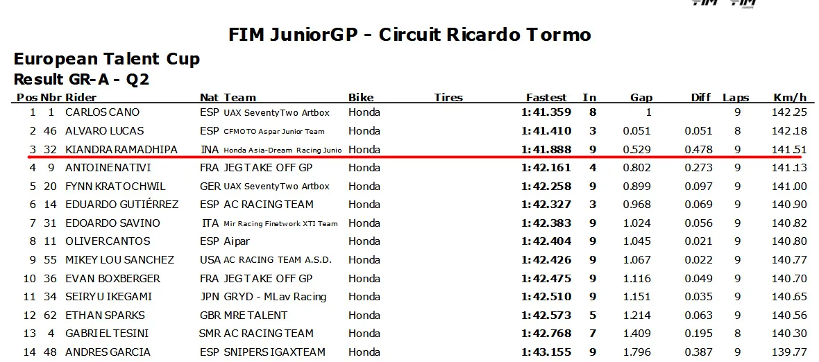 Muhammad Kiandra Ramadhipa Yang membalap di Grup A Kelas European Talent Cup (ETC ) juga berhasil melakukan Awalan yang Bagus di Sesi Latihan Bebas. Bagus di FP1 dan FP2, Ramadhipa berhasil raih posisi tercepat ke-2. di Sesi Practice Rama berada di Posisi tercepat ke 3 Grup A.