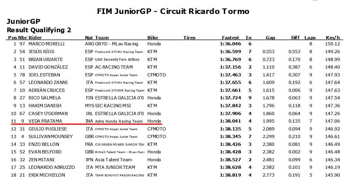 Hasil Kualifikasi : Veda Start dari P11 JuniorGP Valencia 2025