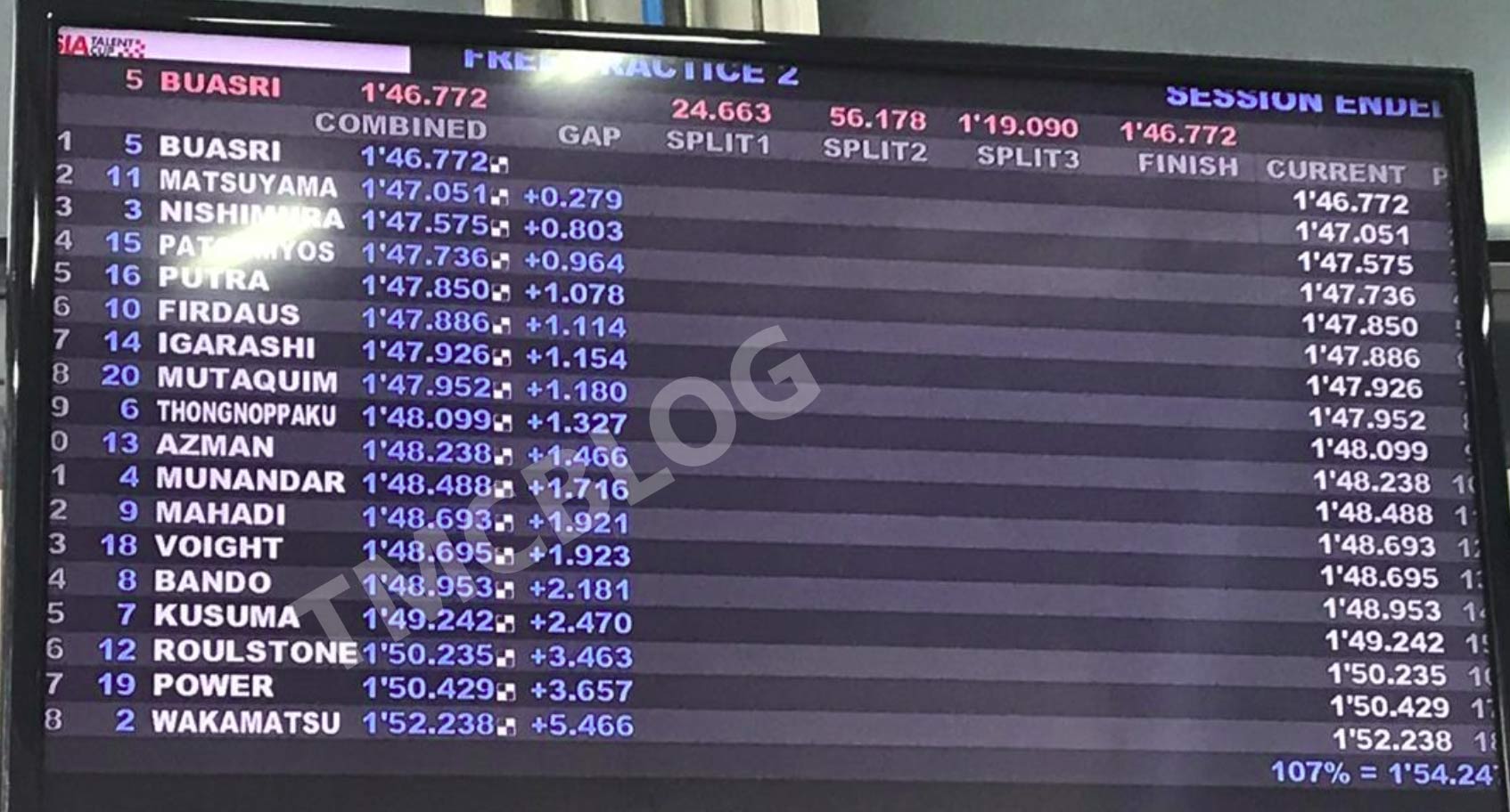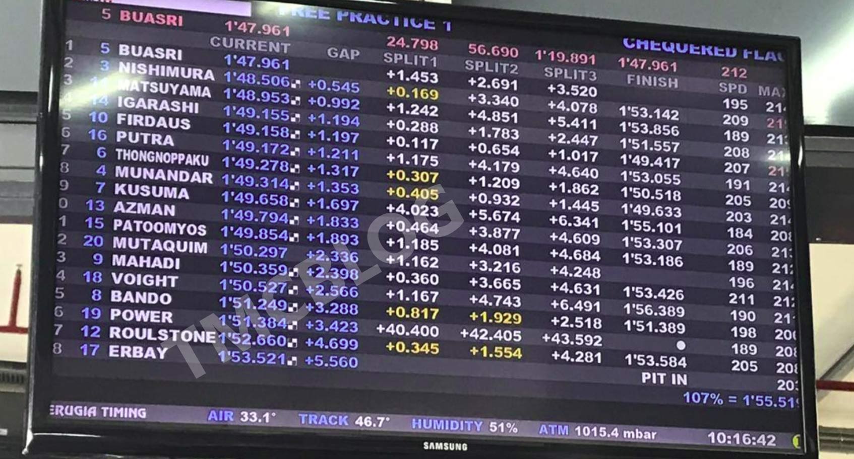 Di FP1 Buasri Berhasil torehkan laptime tercepat 1:47,961 dan meninggalkan Nishimura lebih dari Sebelah detik. Pembalap Indoensia tercepat di FP1 adalah herjun yang ebrada di Posisi 5 dengan Jarak 1,197 detik lebih lelet dari Buasri