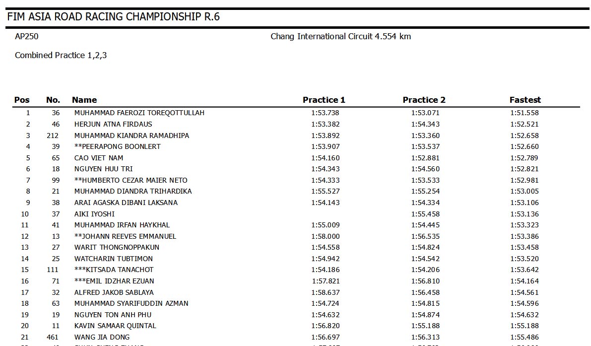 Hasil gabungan dari sesi latihan menunjukkan Faerozi muncul sebagai yang tercepat secara keseluruhan sementara Herjun dan Kiandra tertinggal di belakang yang menyiapkan Podium Kepada pertarungan memperebutkan posisi teratas di sesi Kualifikasi dan race 1 Hari Sabtu ini.