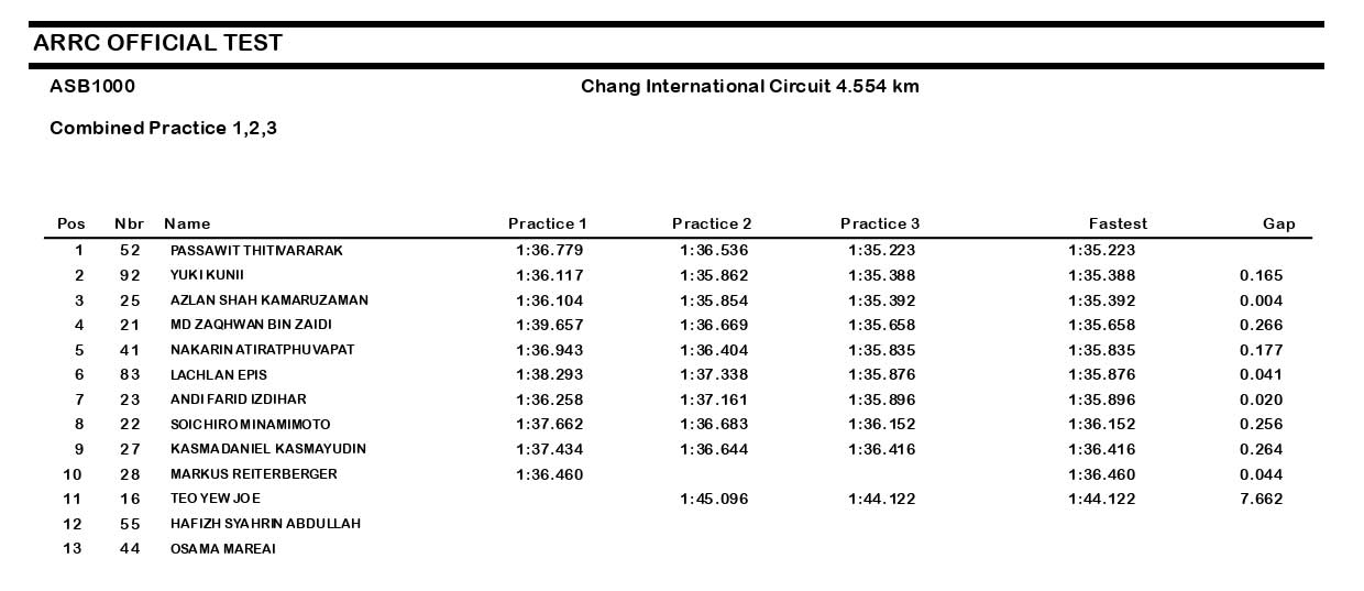 Di kelas para Raja Merukapan Superbike Asia (ASB1000), sesi test pra-musim kali ini hadir kembali pembalap Thailand – Passawit Thitivararak – dengan catatan waktu 1:35,223. Diikuti oleh Yuki Kunii dan Azlan Syah. Pembalap Indonesia – Andi Farid Izdihar – yang membalap dengan Honda Asia Dream menggunakan CBR1000RR-R Fireblade SP berada di posisi 7 dengan jarak 0,6 detik dari Passawit.