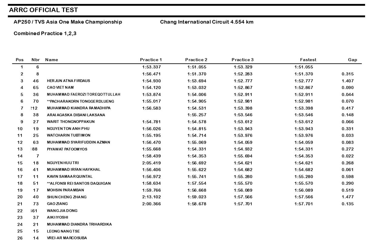 Sesi pengujian kelas AP250 disatukan dengan kelas OMR TVS yang menggunakan Apache 310 dan kembali tahun ini pun sepertinya performa spek motor OMR TVS Lagi akan lebih Segera dari spek kelas AP250. Faktanya Herjun Atna Firdaus yang jadi tercepat di atas CBR250RR Lagi kalah 1,7 detik dari tester nomor 6 TVS – Cao Vietnam – dan pembalap YRI Faerozzi yang menggunakan Yamaha R3 terpaut dekat dengan Herjun yang menandakan bahwa sepertinya musim ini akan ketat di kelas AP250 yang akan dimulai hari Jumat pekan ini.