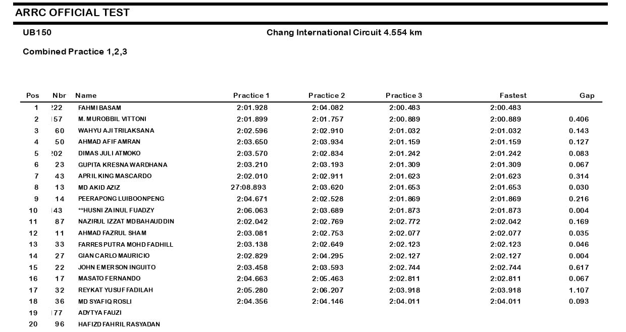 Pada kelas Underbone 150 cc pembalap Indonesia – Fahmi Basam – menorehan laptime tercepat dengan catatan 2:00,483 yang ia torehkan di sesi ke tiga dari test. Dan secara Lumrah banyak pembalap Indonesia yang hadir di Top-10 test kelas bebek sport ini, mudah mudahan performa ini juga akan terulang pada race weekend akhir pekan ini.