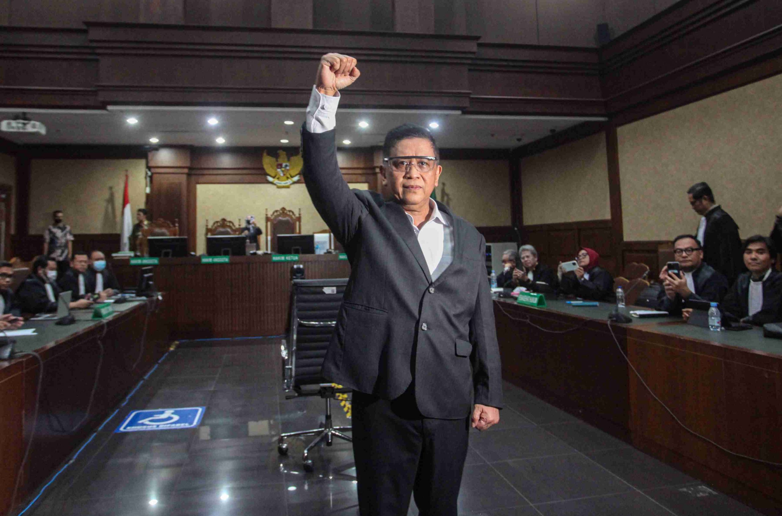 Terdakwa Hasto Kristiyanto berpose Demi tiba di ruang sidang Kepada menjalani pembacaan vonis oleh majelis hakim dalam kasus dugaan suap pergantian antarwaktu (PAW) Personil DPR RI dan perintangan penyidikan terhadap tersangka Harun Masiku di Pengadilan Tipikor, Jakarta, Jumat (25/7/2025). Sekretaris Jenderal PDI Perjuangan tersebut divonis 3 tahun 6 bulan dan denda sebesar Rp250 juta dengan ketentuan subsider tiga bulan kurungan. MI/Usman Iskandar/Ppj