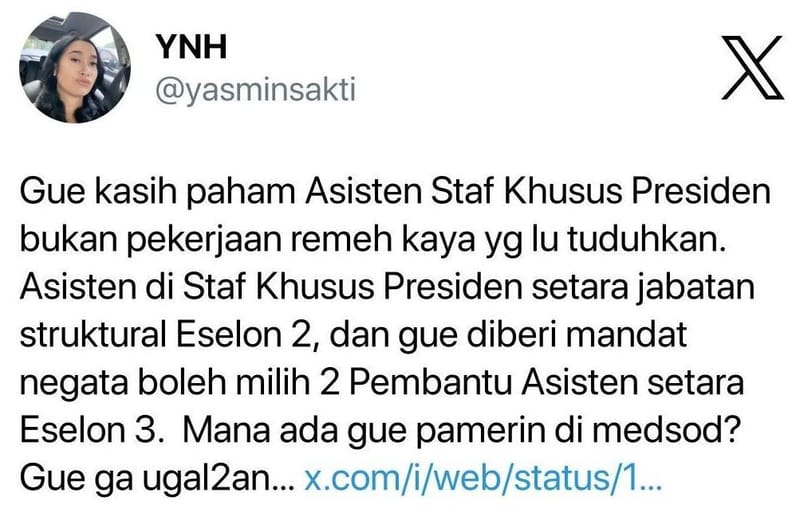 Yasmin menambahkan, dirinya telah telah mengundurkan diri sebagai Asisten Staf Spesifik Presiden per 2023 lalu. Oleh karena itu, segala hal yang terjadi hari ini, tidak bersangkut paut dengan instansi atau kelembagaan manapun.