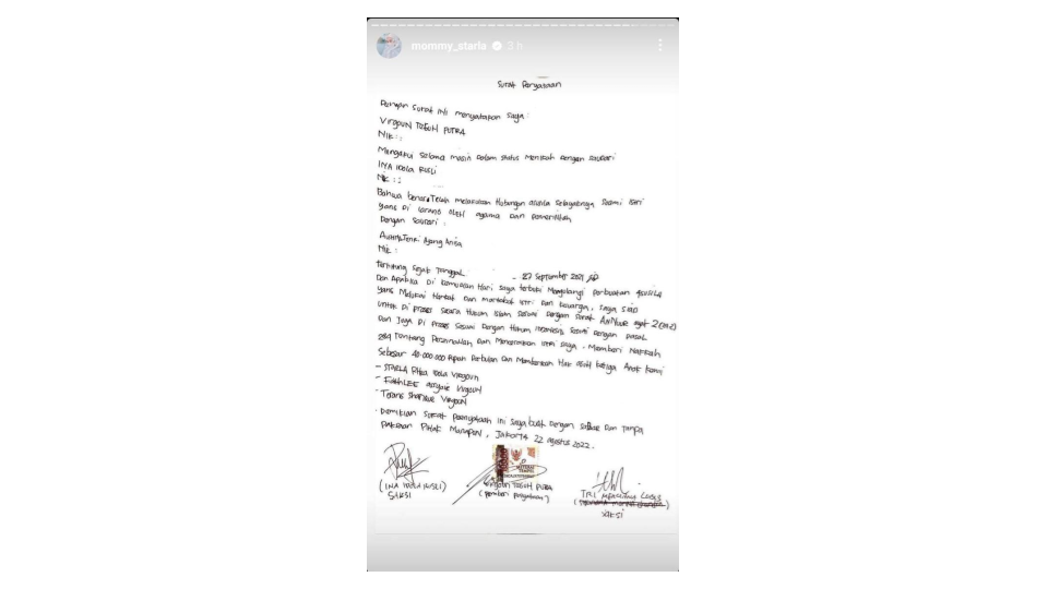 Selain rangkaian tangkapan layar bukti percakapan, Inara mengunggah sebuah surat pernyataan yang ditandatangani oleh Virgoun di atas materai.