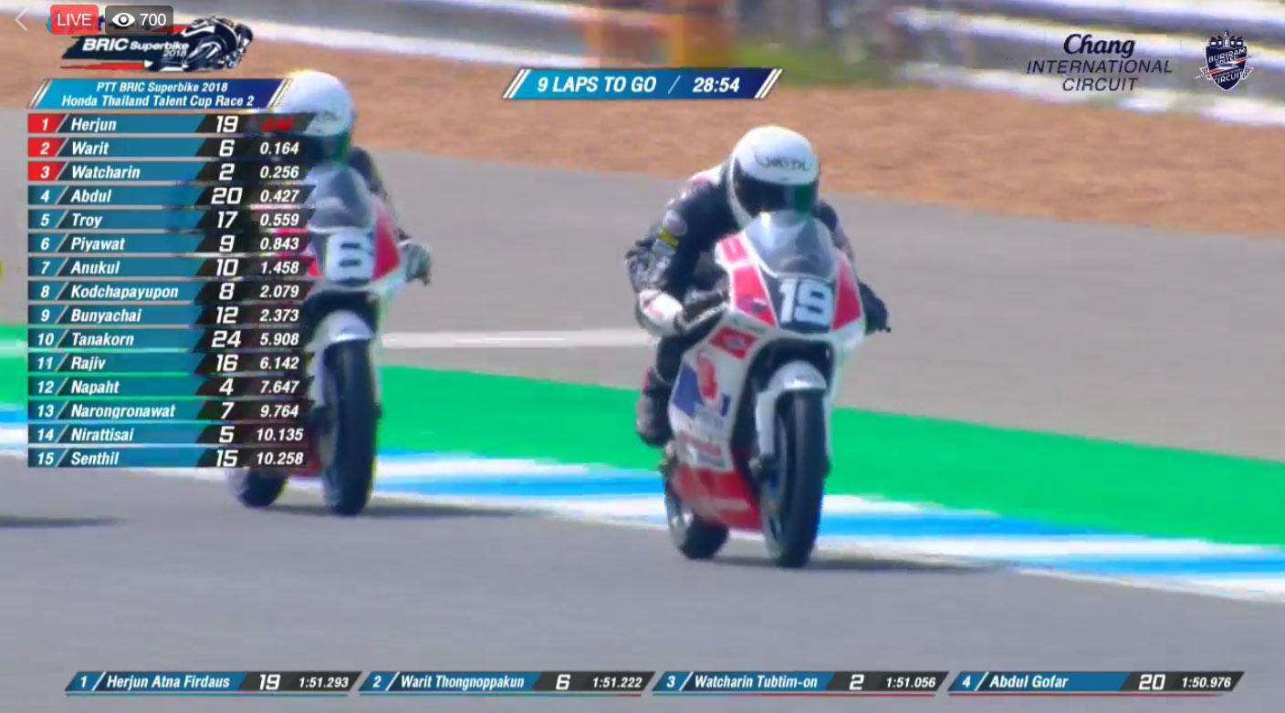 walaupun herjun berkali kali diusik oleh pembalap lain seperti troy Alberto maupun Warit Thongnoppakun Tetapi beebrapa Kali juga herjun yang mengguankan No start 19 Bisa recovery posisi memimpin race . . menarik seperti layaknya Balap One Make race, pack depan terlihat padat dan berdekatan . .