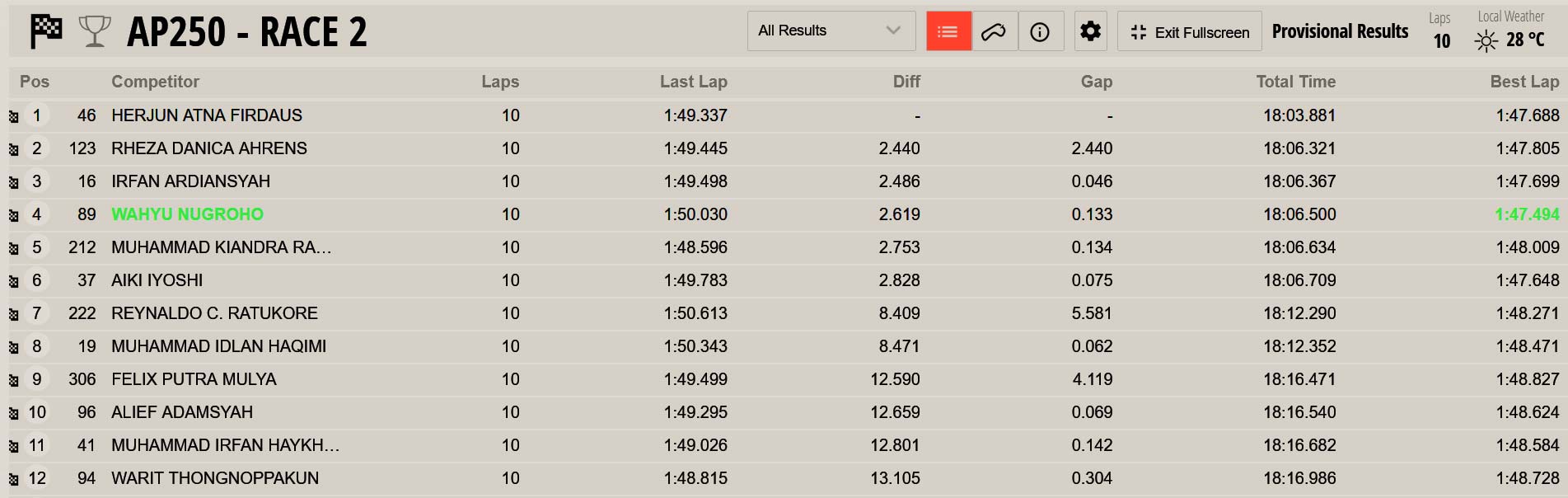 lap dua Kiandra Memimpin balapan diikuti Muklada dan Wahyu Nugroho. Aldi satya Crash. Lap 3 Muklada memimpin diikuti Wahyu Nugroho dan Kiandra. Jelang Lap 4 Rheza naik ke posisi tiga Tetapi Aiki Iyoshi memimpin di depan Muklada dan Wahyu. Lap 5 Faerozzi Crash di T1. Lap 6 Herjun memimpin 0,6 detik dari Muklada dan Irfan. Muklada Crash di Sektor dua.
