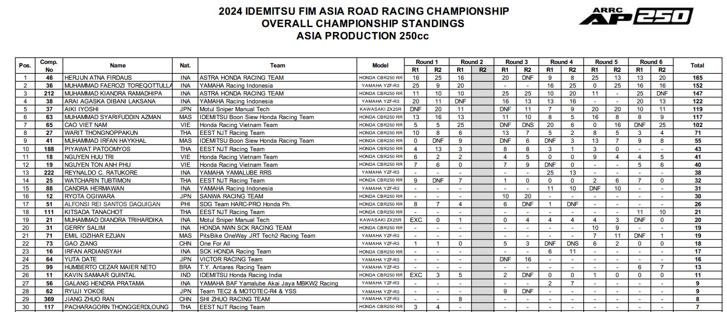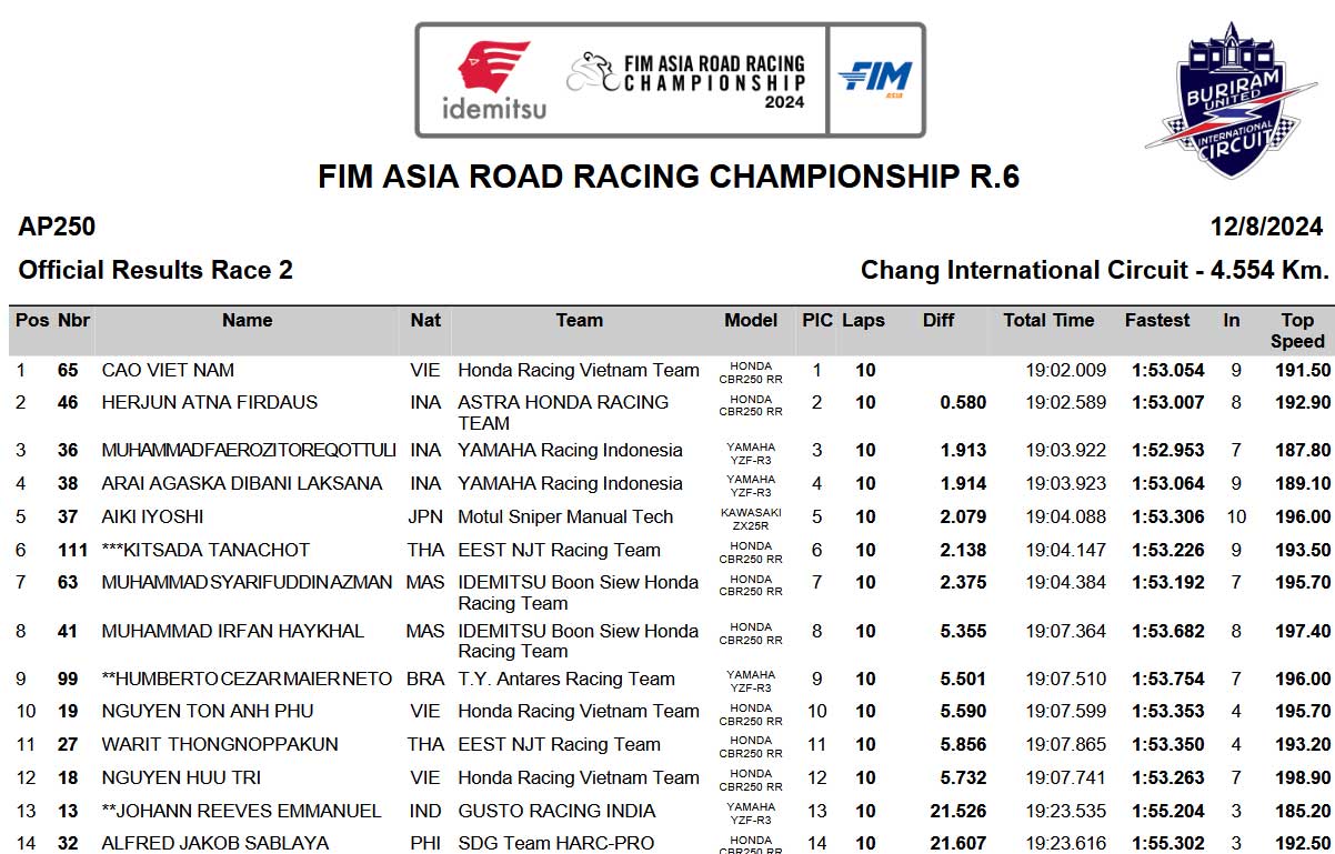 Dan setelah 10 Lap akhirnnya Cao Vietnam memenangkan Balapan sehingga hasil akhir menempatkan Herjun yang finish P2 Sebagai Pemenang Asia kelas AP250 2024. Faerozzi finish Podium 3.