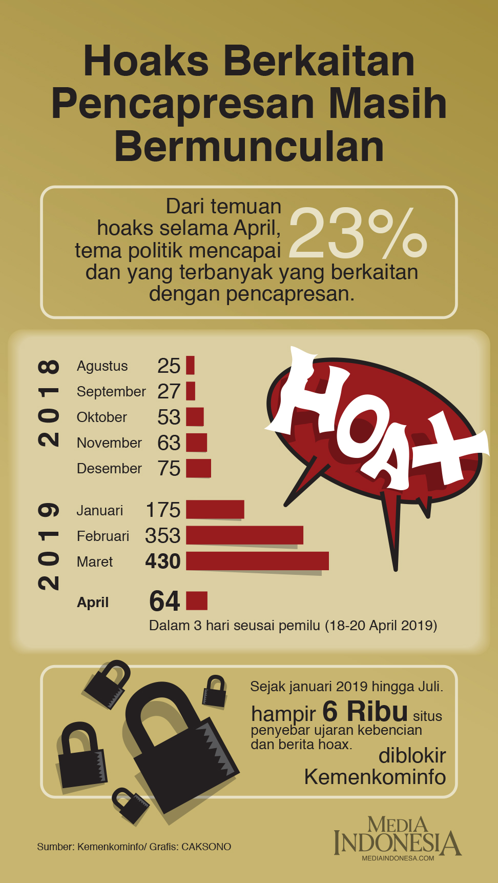 Dari Intervensi hoaks selama April, tema politik mencapai 23% dan yang terbanyak yang berkaitan dengan pencapresan.