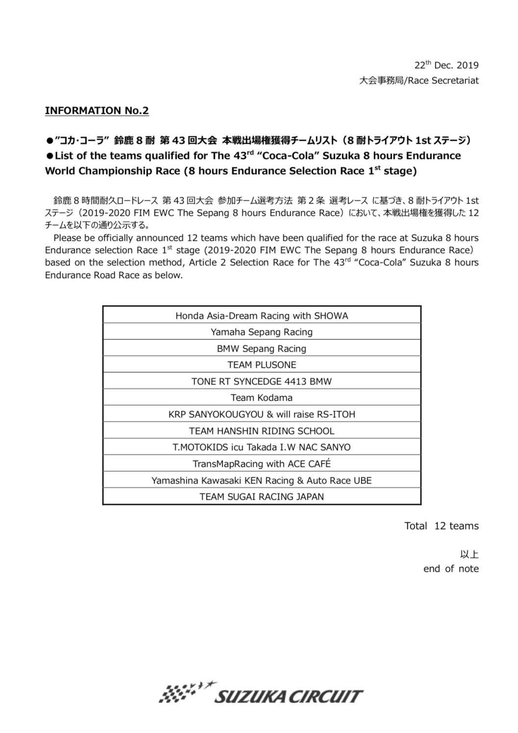 Sobat Bisa lihat di Arsip di atas Yang berkop Suzuka Circuit Terdapat 12 Team termasuk Honda Asia Dream racing, dan Yamaha Sepang Racing team yang menggunakan sumber daya dan persiapan Logistik dari YART Yamaha yang di sepang 8H menjadi Pemenang.