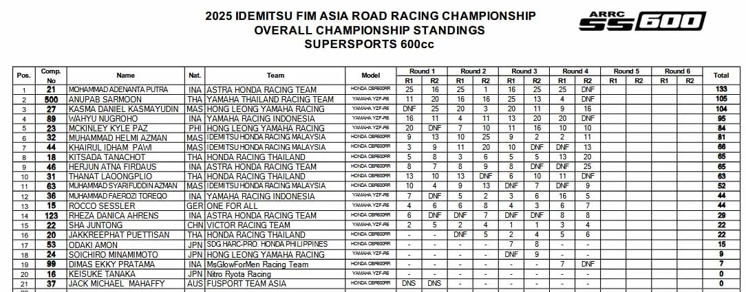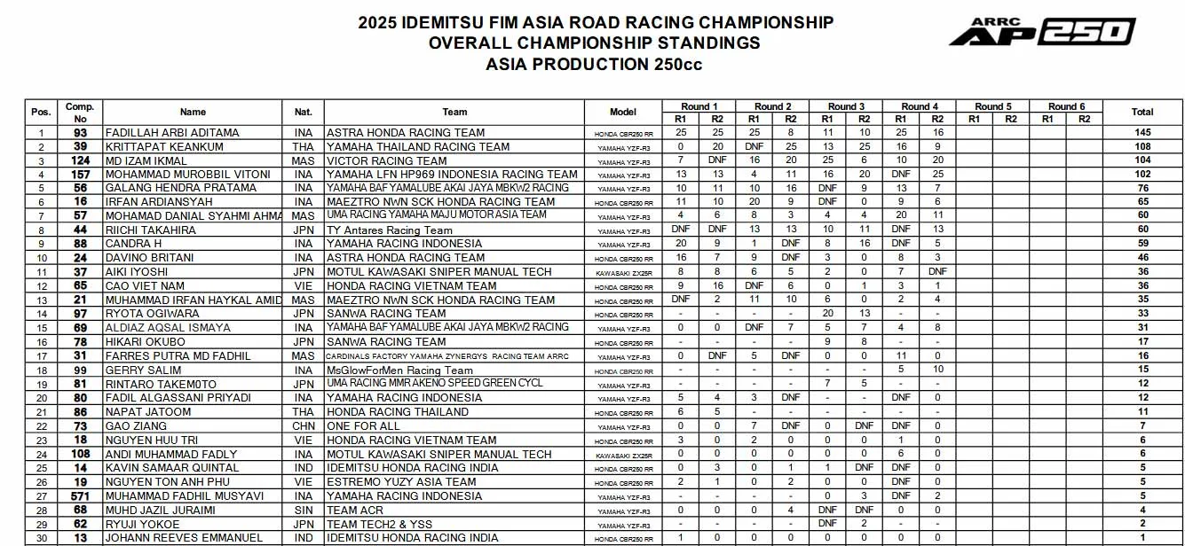 Tambahan satu hasil podium Membikin Arbi Tetap kokoh menguasai puncak klasemen AP250 dengan 145 poin, sementara Davino Tetap berada di peringkat ke-10 dengan 46 poin. Di kelas SS600, Adenanta tetap menjadi pengumpul poin terbanyak meskipun gagal meraih poin pada balapan kedua di Mandalika. Dengan 133 poin, dia Tetap unggul 28 Nomor atas pebalap di peringkat kedua.